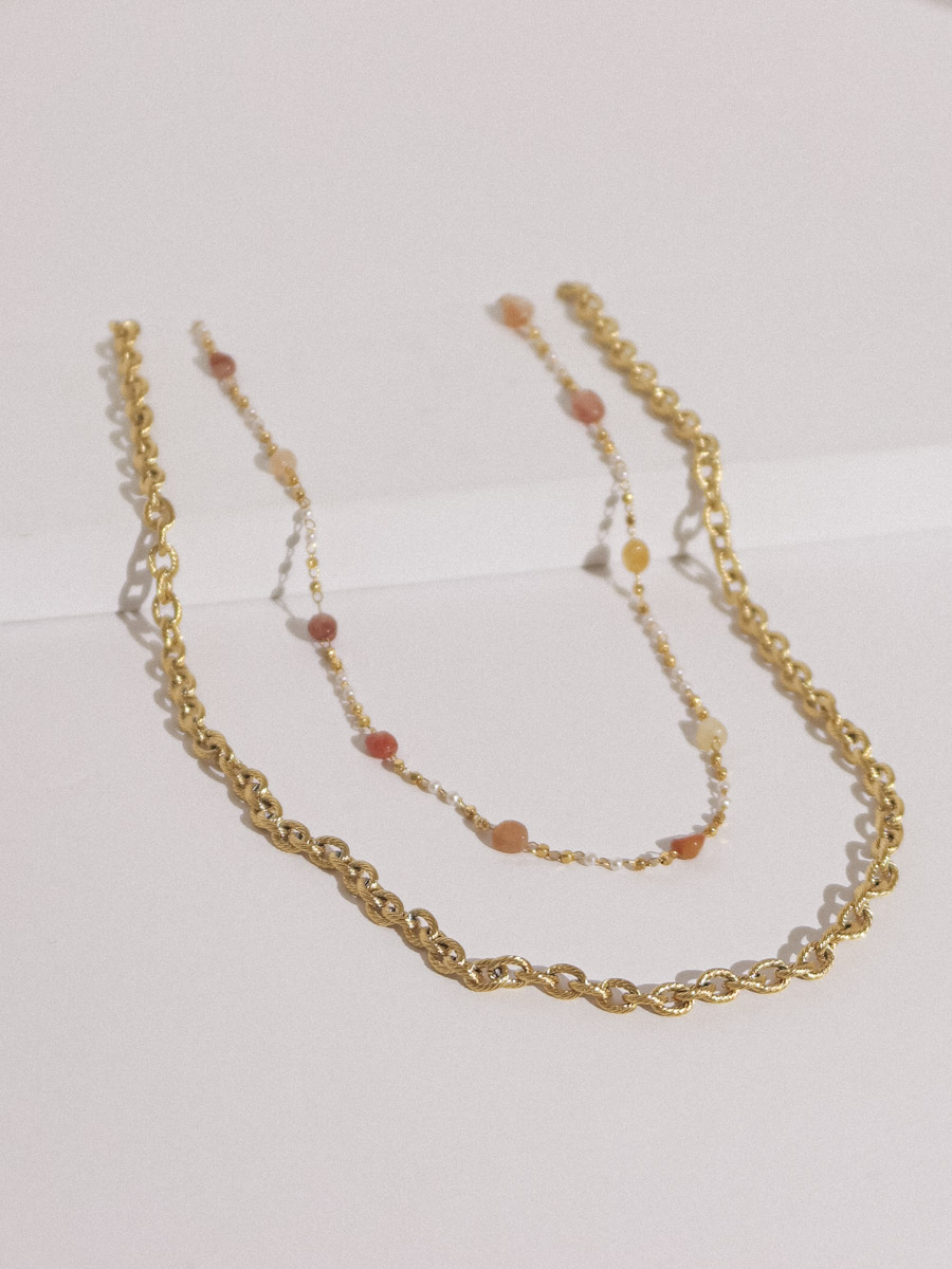 סט שרשראות בשכבות שמחבר בין רכות לאלגנטיות בקו נקי ועל-זמני. שילוב מדויק של שרשרת רומי הצמודה עם אבני אגט ופנינה, לצד שרשרת גורמט קלאסית בחיתוכי לייזר עדינים, יוצר לוק מאוזן שמתאים ליומיום ולרגעים מוקפדים יותר. הסט עשוי Stainless steel איכותי, שתיהן עמידות במים, אינן משחירות ומתאימות לשימוש יומיומי, השרשראות אינן מחוברות אחת לשניה כך שניתן לענוד גם בנפרד.