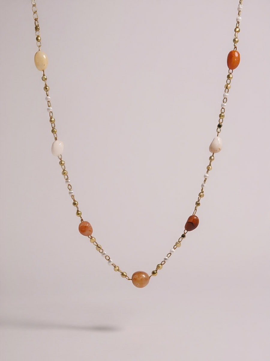 שרשרת אבני אגט משולבת בחיתוכי לייזר וחרוזי פנינה, בעיצוב עדין ונעים שמעניק תחושת אלגנטיות ויוקרתיות. מושלמת להשלמת סט שרשראות, אך גם יכולה להוות פריט בולט בפני עצמו. עיצוב שמוסיף נופך ייחודי ותחכום לכל לוק.