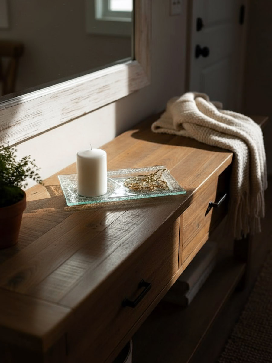 מגש זכוכית דקורטיבי בעיצוב ייחודי עם טקסטורת בועות עדינה וזכוכית שקופה בגוון קרח. מתאים לנר, תכשיטים או להגשה אלגנטית, ומשתלב בקלות בעיצוב שולחן או פינת קישוט בעדינות מודרנית ונקייה.